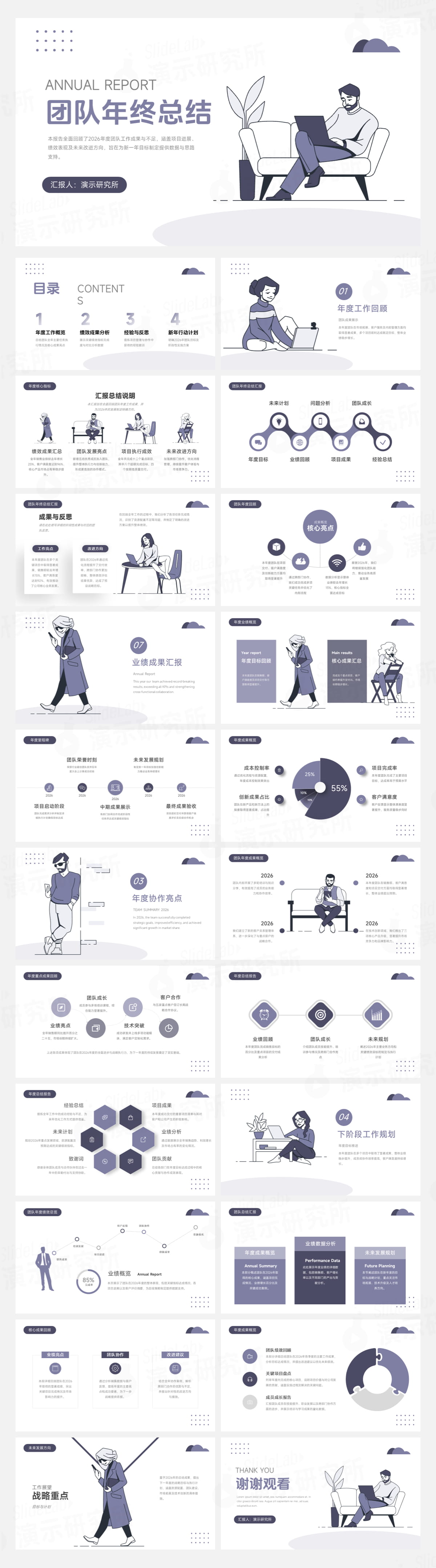 淡紫人物插画风团队年终总结PPT