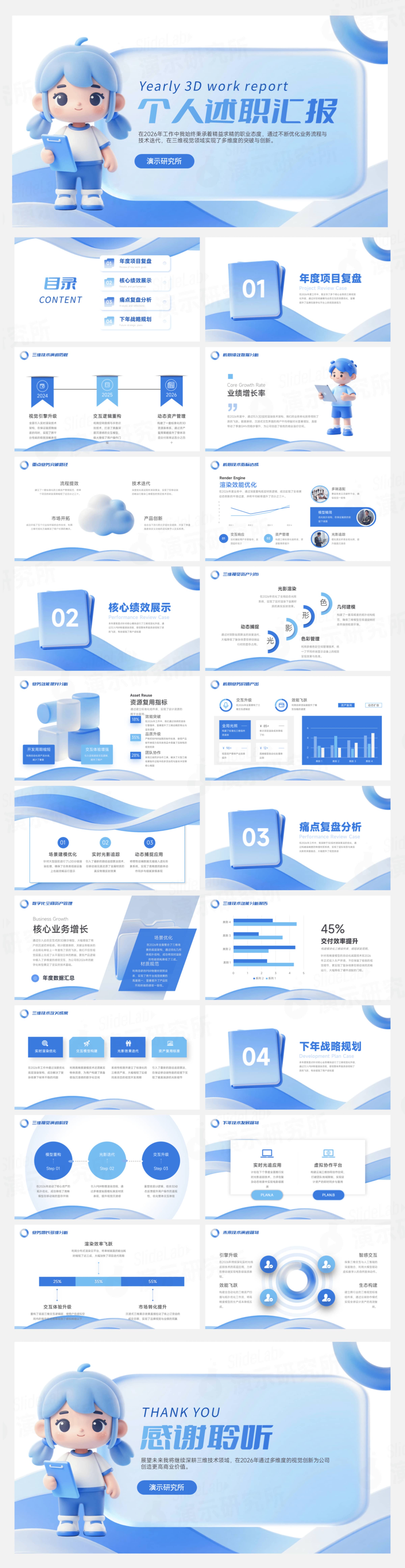 蓝白渐变3D卡通人物述职汇报通用PPT模板