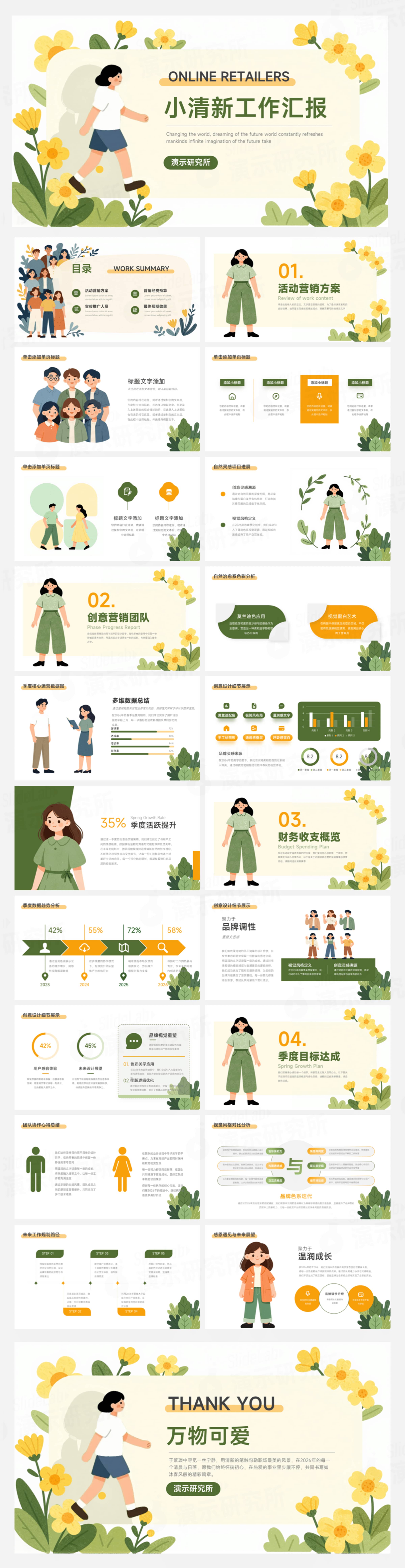 人物办公卡通可爱展示总结插画文艺柔和汇报浅绿清新电商简约职场自然花卉设计通用零售